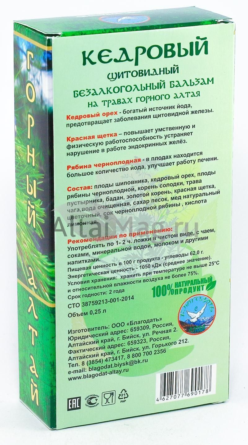 • Купите Алтайский Кедровый Бальзам (Щитовидный), 250 мл в Бресте по доступной цене 297 ₽ с доставкой на дом или заберите Ваш заказ в Бресте из ближайшего пункта выдачи, сделав заказ на AltaiMag.ru.