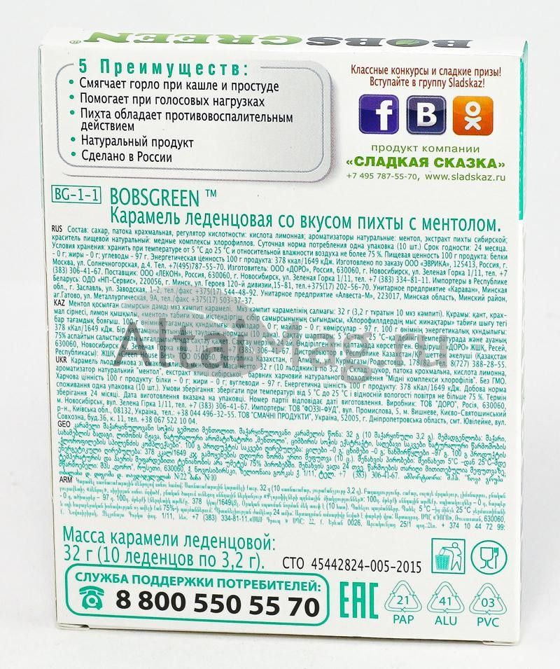 - Чтобы купить Бобс Грин леденцы (пихта и ментол), 32 г совершите всего несколько шагов: укажите количество продукта и нажмите на кнопку «Купить».