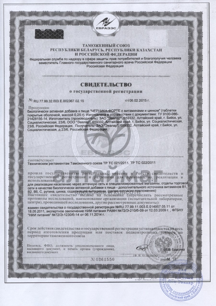 БАД «Черника-Форте» с витаминами и цинком производится только из экстракта плодов черники с добавлением витаминов группы B (В1, В2, В6), витамина С и микроэлемента цинка. Подлинность и качество каждой партии БАД «Черника-Форте» подтверждается наличием антоцианов плодов черники и необходимым суточным количеством витаминов и цинка.