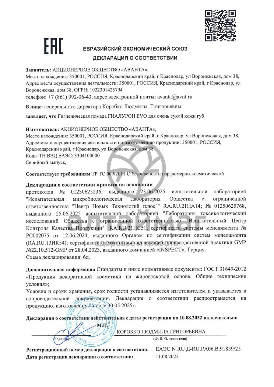 - Чтобы купить Эво Гиалурон помада для очень сухой кожи губ совершите всего несколько шагов: укажите количество продукта и нажмите на кнопку «Купить».