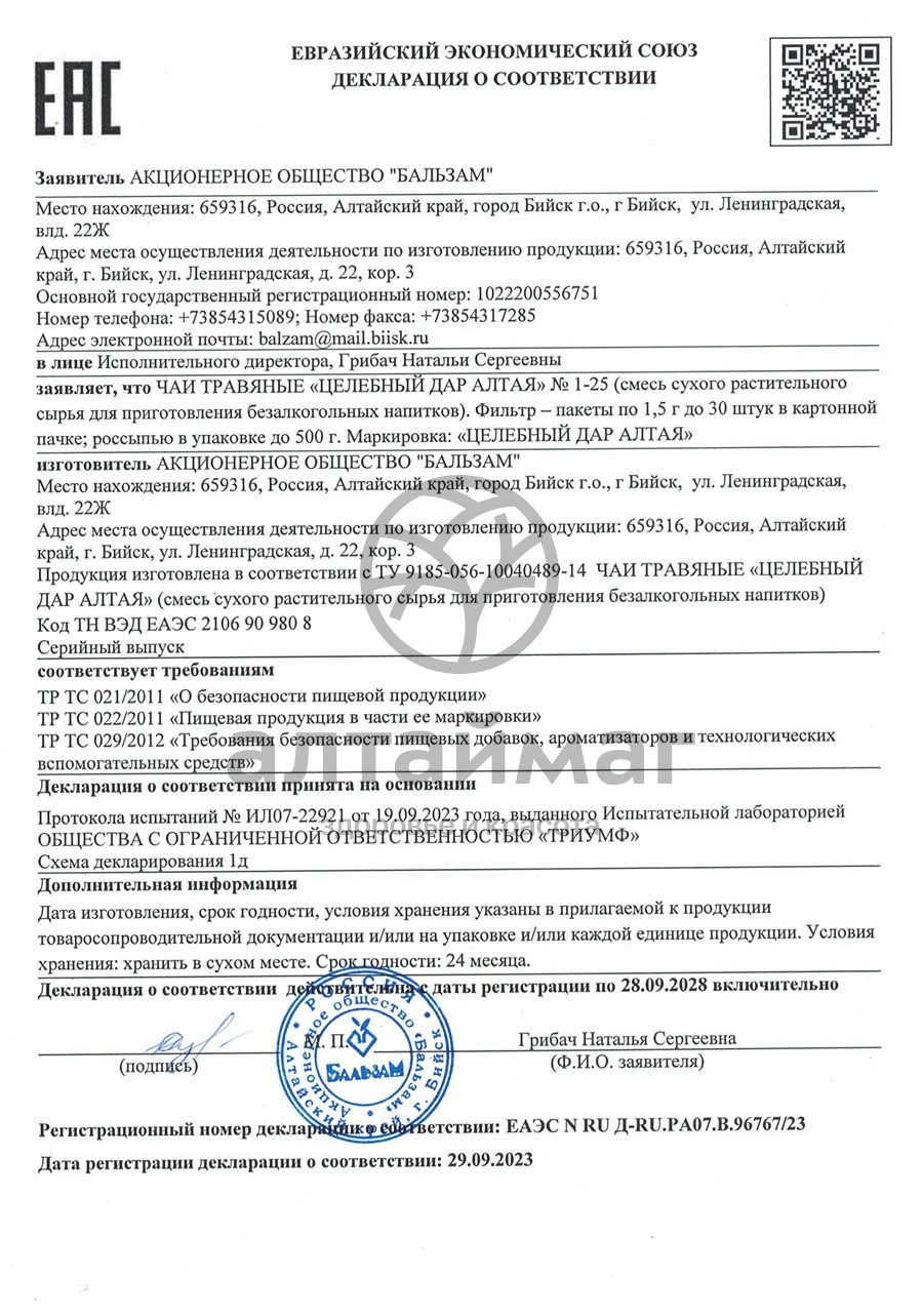 Натуральные травяные чаи Целебный дар Алтая изготовлены из ценнейших лекарственных растений, ягод и плодов, бережно собранных в экологически чистых районах Алтая. Попробуйте травяной чай, из коллекции Целебный дар Алтая, и он наполнит Вас силой могучих гор, бодростью горных рек, энергией и здоровьем сибирской тайги, создаст атмосферу приятных воспоминаний или мечтаний об удивительных путешествиях на Алтай. Сбор оказывает противовоспалительное, антибактериальное, спазмолитическое действие, мочегонное и общеукрепляющее. Увеличивает количество гемоглобина, эритроцитов, тромбоцитов в крови. Устраняет последствия стрессовых реакций, снимает раздражение.