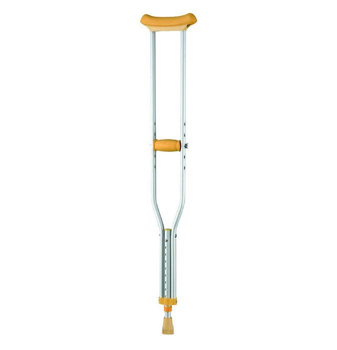 Костыли подмышечные. Амортизирующие протекторы на ручки изготовлены из вспененной резины, ручки и подмышечные опоры покрыты мягким полимерным материалом, регулируемая высота от 132-152 см, вес изделия – 0,8 кг, максимальная нагрузка - 150 кг, съемные резиновые нескользящие насадки.