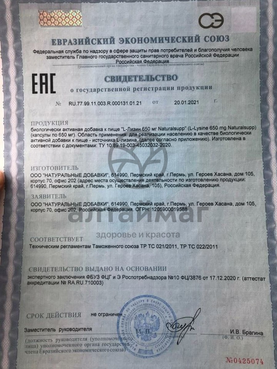 - Купите L-лизин 650мг Naturalsupp №60 в Бресте по доступной цене 404 ₽ с доставкой на дом или заберите Ваш заказ в Бресте из ближайшего пункта выдачи, сделав заказ на AltaiMag.ru.