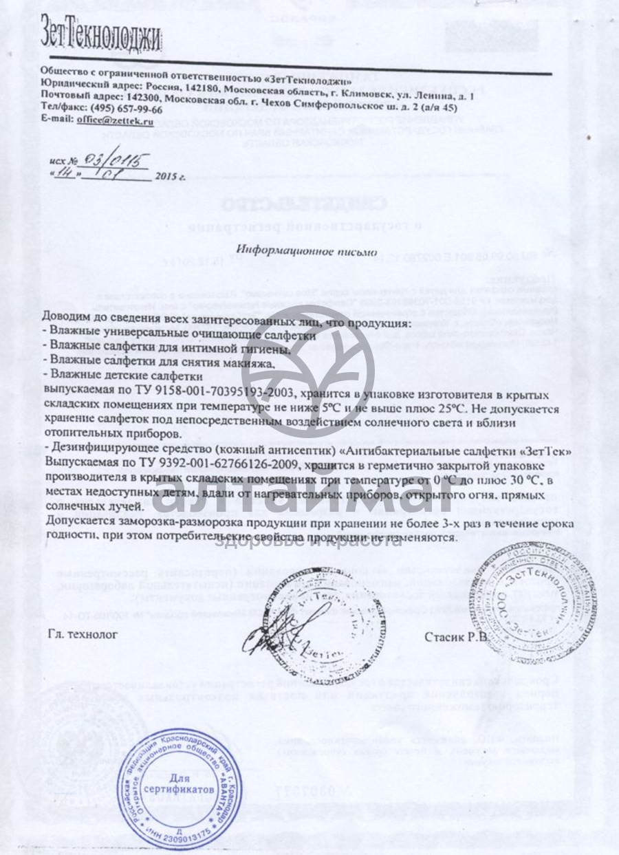 Состав: нетканое полотно, пропитывающий лосьон. Состав пропитывающего лосьона: вода деминерализованная, глицерин , глицерет-2 кокоат, ПЭГ 40 гидрогенизированное касторовое масло, феноксиэтанол, этилгексилглицерин, экстракт ромашки, аллантоин, натуральный бисаболол, витамин Е, динатрий ЭДТА, коллоидное серебро, парфюмерная композиция, масло чайного дерева Состав пропитывающего лосьона INCI: Aqua, Glycerin , Glycereth-2 Cocoate , PEG-40 Hydrogenated Castor Oil, Phenoxyethanol, Ethylgexyl Glycerin, Camomilla Recutita Flower Extract, Allantoin, Bisabolol, Tocopheryl Acetate, Disodium EDTA, Colloidal Silver Oligo, Parfum, Melaleuca Alternifolia(Tea Tree) Leaf Oil |