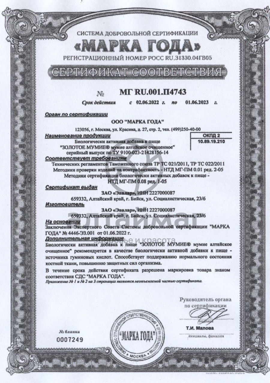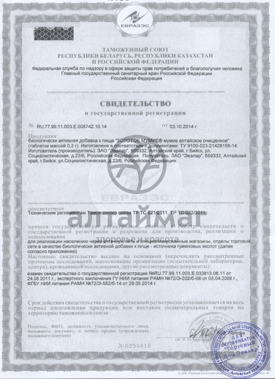 100% мумие высокого качества с широким спектром биологической активности. В каждой таблетке высокое содержание активных действующих веществ, поэтому продукту «Мумие алтайское очищенное» присвоена марка "Золотое мумие". "Золотое мумие" выпускается по патентованной технологии (патент РФ № 2066993), обеспечивающей максимальную степень очистки сырца мумие при сохранении всех его целебных свойств.
