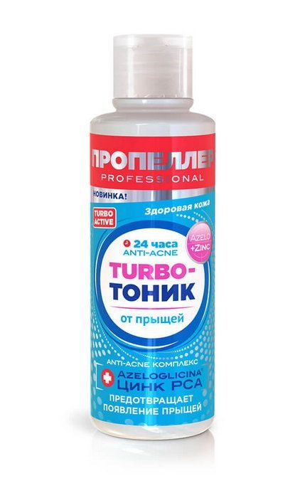 Пропеллер «TURBO-ТОНИК» от прыщей - эффективный и бережный уход за проблемной кожей, не требует смывания. Тонизирует и успокаивает кожу. Оказывает противовоспалительный эффект, предотвращает появление прыщей. Выравнивает тон кожи, улучшает цвет лица, способствует очищению пор кожи, устраняет жирный блеск.
