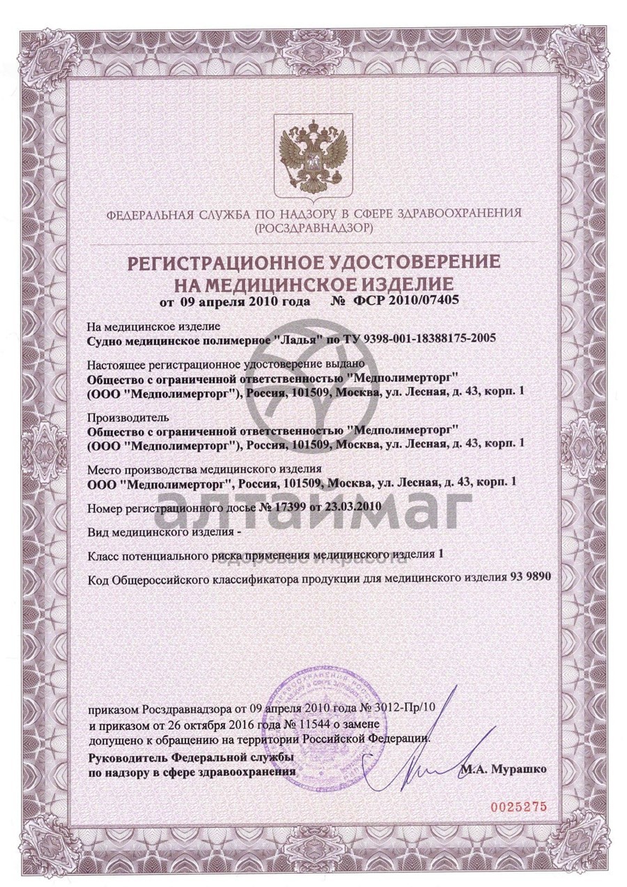 Судно подкладное медицинское полимерное "Ладья" - специальное приспособление для осуществления испражнения и мочеиспускания больного в кровати, который по тем или иным причинам не может испражняться в туалете. Судно подкладное полимерное очень легкое и удобно в применении, его поверхность при соприкосновении с телом быстро приобретает его температуру (эффект "теплого материала"), изделие хорошо очищается, быстро и легко дезинфицируется.Особенность подкладного судна полимерного - состоит в том, что его передняя часть, которая вставляется под крестец, очень низкая. Такое судно хорошо использовать у тех больных, которые не могут высоко приподнимать таз или испытывают сильные боли при изменении положения в кровати.