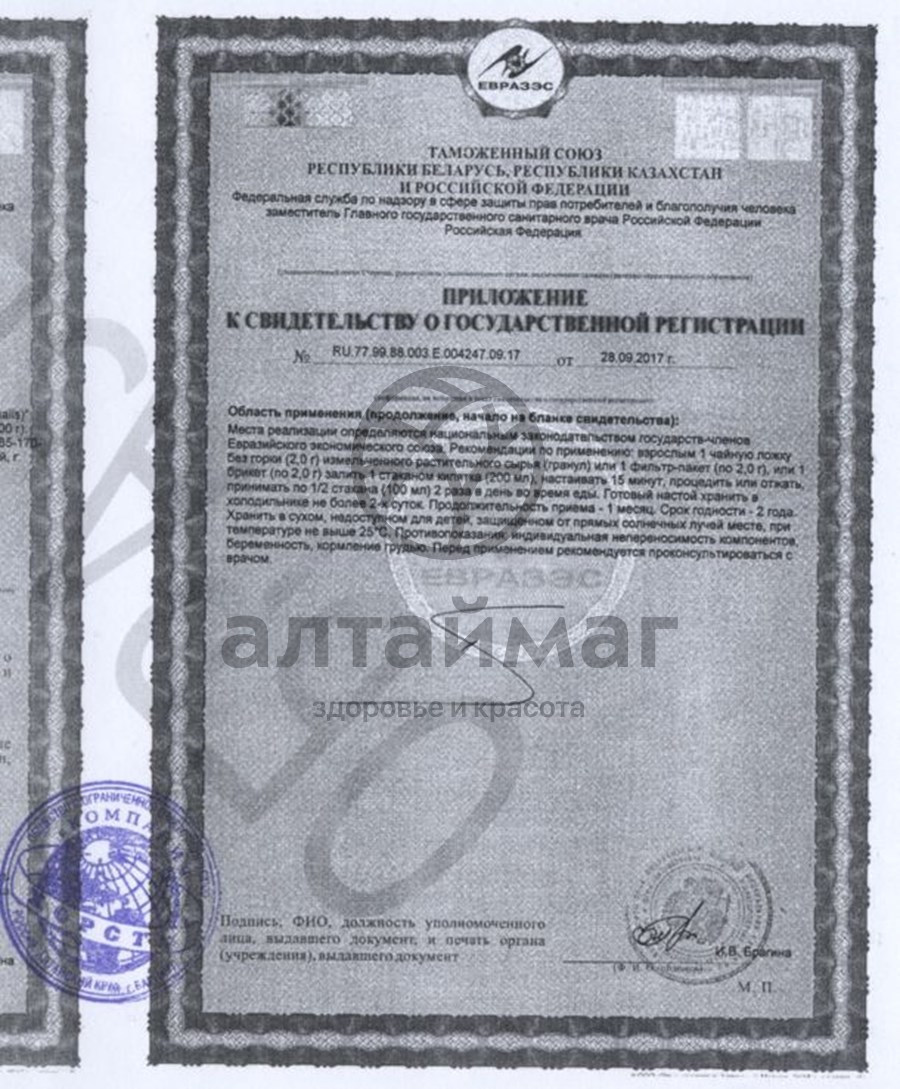 россыпь (масса нетто 50г), фильтр-пакеты 20 шт. по 2,0 гр.Регистрация: